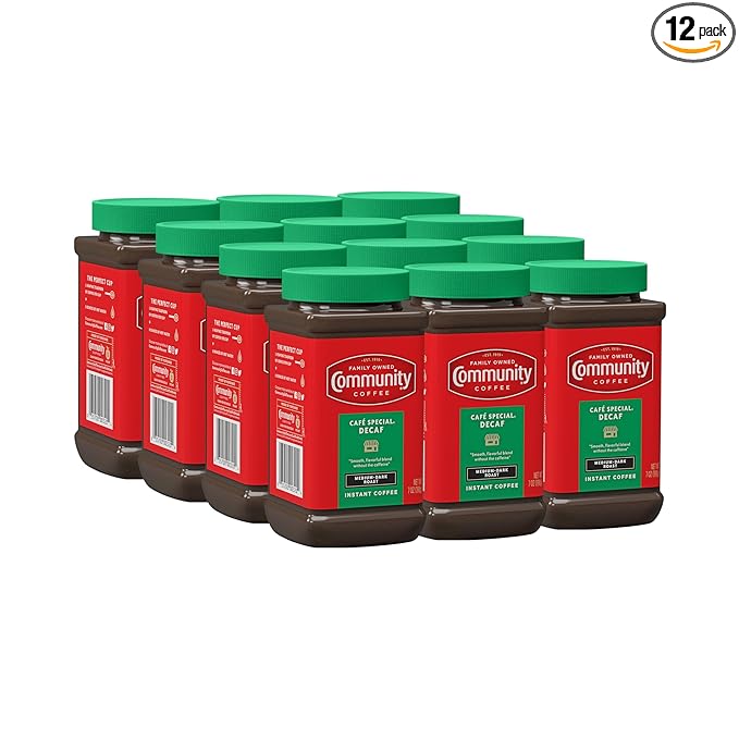 Community Coffee Café Special Decaf Instant Coffee, Medium Dark Roast, 7 Ounce Jar (Pack of 12)