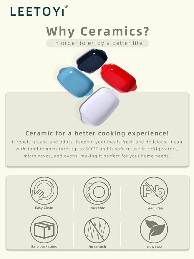- Ceramics:This Baking Dish is made of ceramic.The baking set surface is smooth and bright, and it is very easy to clean.At the same time,It can be used in the oven, microwave, freezer and dishwasher.