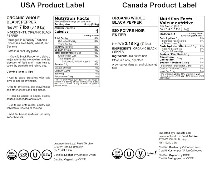 Food to Live - Organic Black Pepper, 7 Pounds - Whole Dried Peppercorns, Non-GMO, Kosher, Vegan, Bulk, Great for Spicing and Seasoning, Perfect for Grinder Refill