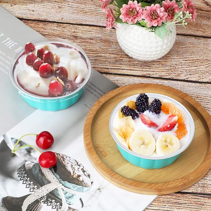 - 【Convenient Use】With the good quality aluminum foil material which is designed for bakery, you can directly put the baking cup on the fire to use (but please do not put the empty cups on the fire), with faster heat conduction to use less energy. 8oz for each pan with lid, it's a good way for serving individual portions for guest in gathering.