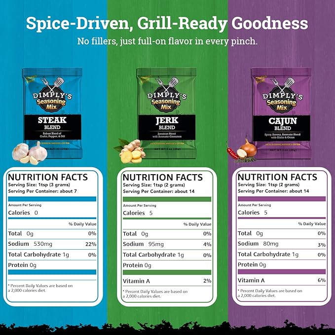 - BOLD FLAVOR TRIO. This variety pack brings together three distinct blends: the fiery Jamaican Jerk, the savory Steak Seasoning, and the zesty Cajun mix. Each offers a unique taste experience, from the sweet heat of the jerk to the dill-infused steak and the spicy kick of Cajun. Perfect for experimenting in the kitchen or spicing up your grilling game, these blends are your ticket to flavor town.