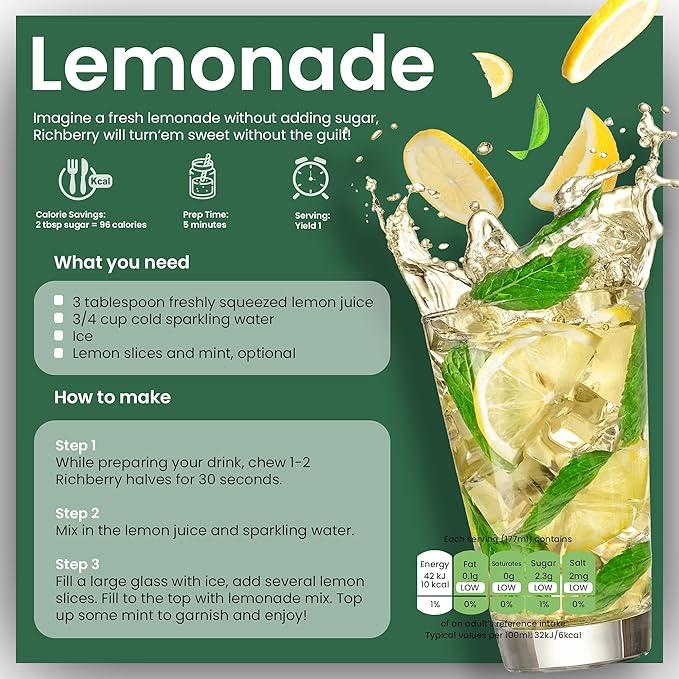 - NATURALLY SWEETENS SOUR FOOD – Supercharge your taste buds! Turns sour foods such as lemons, limes, strawberries, grapefruit and many more to taste sweet without adding sugar. Try your next lemonade with richberry.
