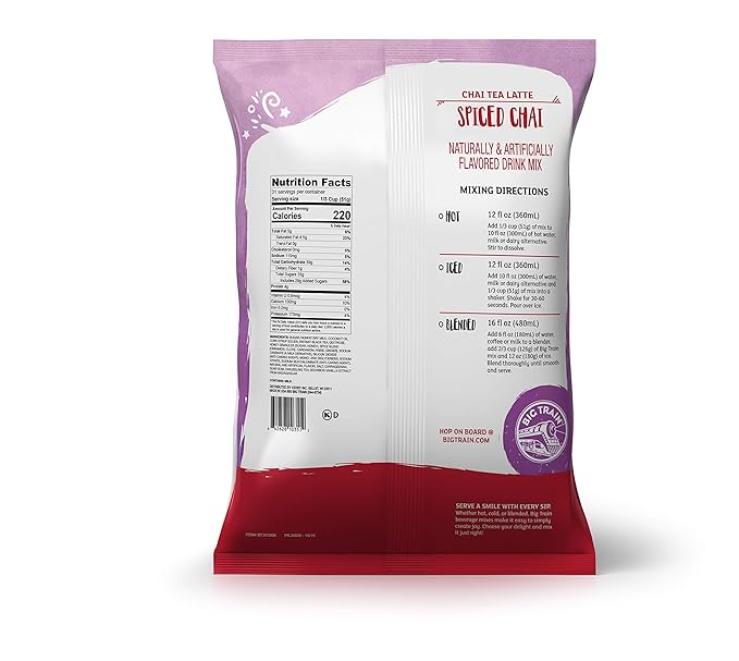 - Product 1: BIG TRAIN SPICED CHAI: Our Spiced Chai Mix is made with a blend of milk, honey, black tea, & spices for a sweet, creamy chai tea latte that you can mix up in an instant. Just add water! Drink hot & steamy or use cold water & pour over ice for an iced treat