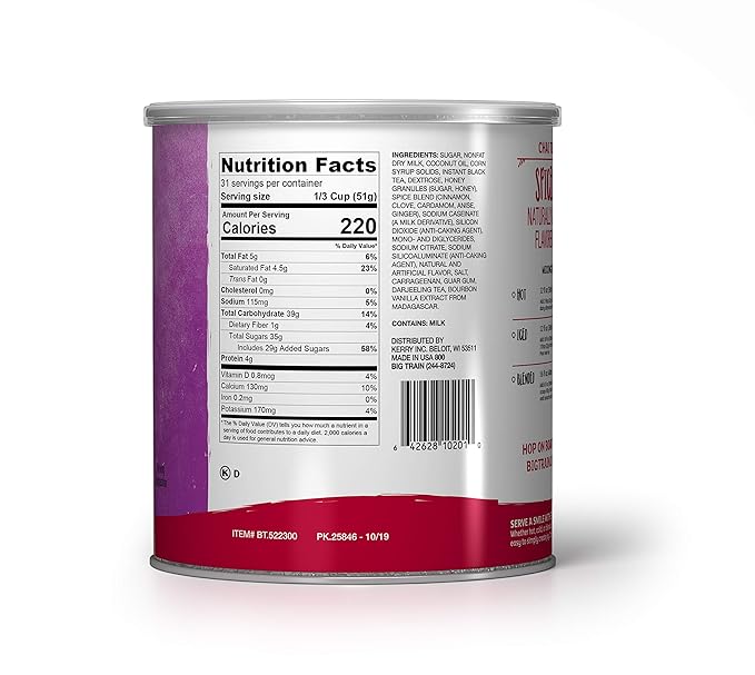 - Product 2: BIG TRAIN SPICED CHAI: Our Spiced Chai Mix is made with a blend of milk, honey, black tea, & spices for a sweet, creamy chai tea latte that you can mix up in an instant. Just add water! Drink hot & steamy or use cold water & pour over ice for an iced treat