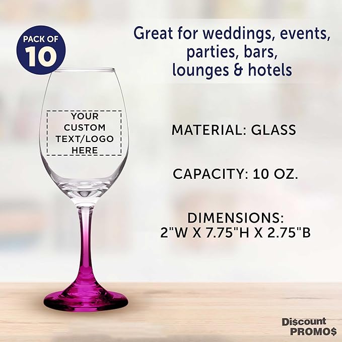 Custom Rioja Wine Glasses with Stem 10 oz. Set of 10, Personalized Bulk Pack - Color Bottom, Perfect for Wedding, Party Favors, Birthday, Bridal Shower Gifts - Pink
