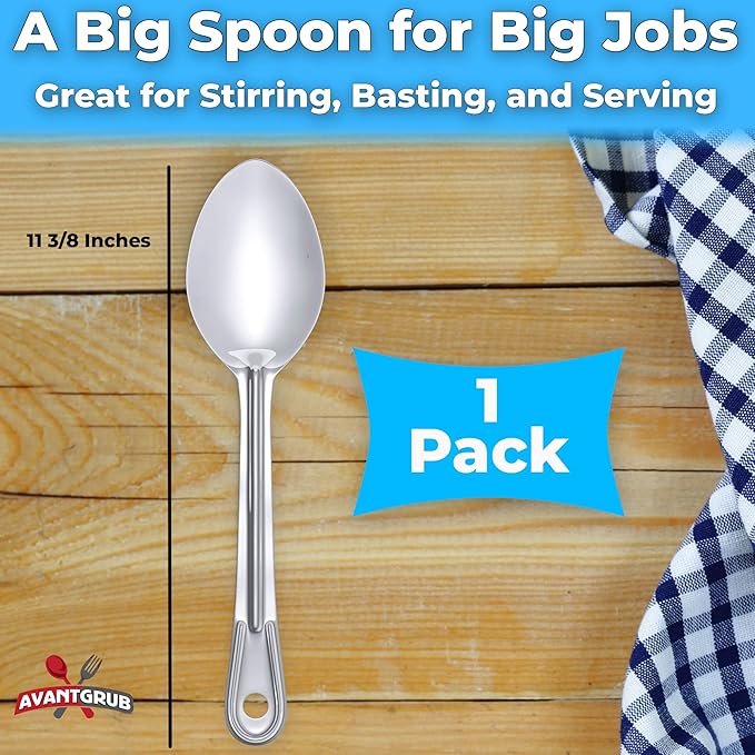 Super Strong, Ergonomic 11 in Serving Spoon 1 Pk. Big, Solid Stainless Steel Spoons for Cooking, Baking and Basting. Best Kitchen Flatware for Buffet and Banquet Service in Restaurants and Homes