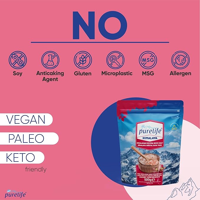 - KOSHER PINK TABLE COARSE 100% NATURAL HIMALAYAN SALT: Purelife Pink Himalayan Salt is a Gluten, Soy, Allergen, MSG and Anti-Caking Agent free unrefined Crystal Rock Kosher Salt. Suitable for vegan, paleo and keto use. Obtained from the highest quality Pure Himalayan Rock Salt mines in Pakistan as ready to be ground pink salt coarse grains. Purelife Pink Coarse Salt has been packed in KOSHER and ISO 22000 FOOD SAFETY MANAGEMENT SYSTEM certified facility.
