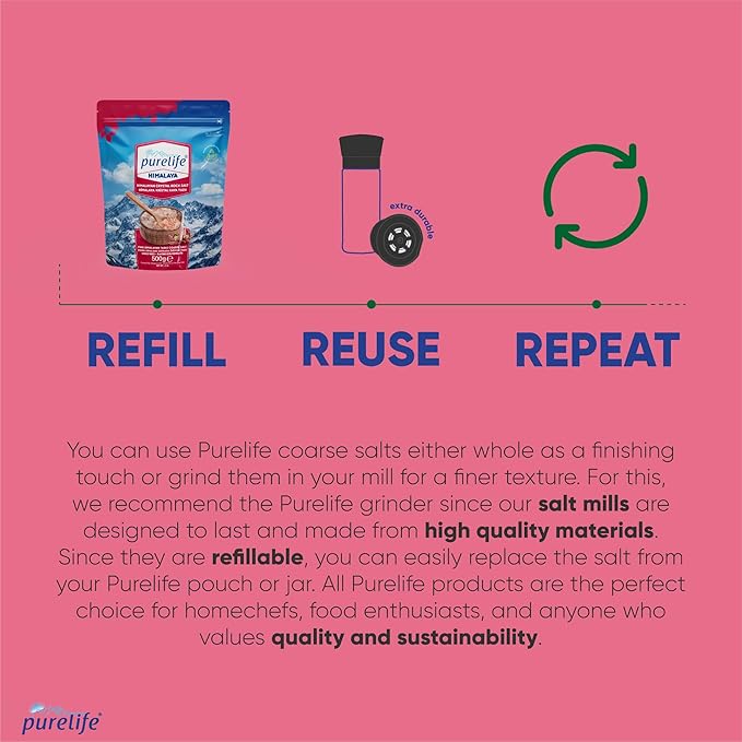 - FILL YOUR SALT MILL WITH THIS GRINDER READY COARSE GRAINS: Purelife Himalayan Coarse Pink Rock Salt has a perfect size to fit all type of salt mills & grinders. Refill your Purelife Himalayan Salt Grinders with Purelife Pink Salt Coarse Grains. Great taste and larger grains; Table Coarse Salts are preferred by Chefs. It is a gourmet pink rock salt that ready to be ground to fine and extra fine salt grains.