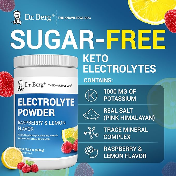 Dr. Berg Zero Sugar Hydration Keto Electrolyte Powder - Enhanced w/ 1000 mg of Potassium & Real Pink Himalayan Salt (NOT Table Salt) - Raspberry & Lemon Flavor Hydration Drink Supplement, 100 Servings