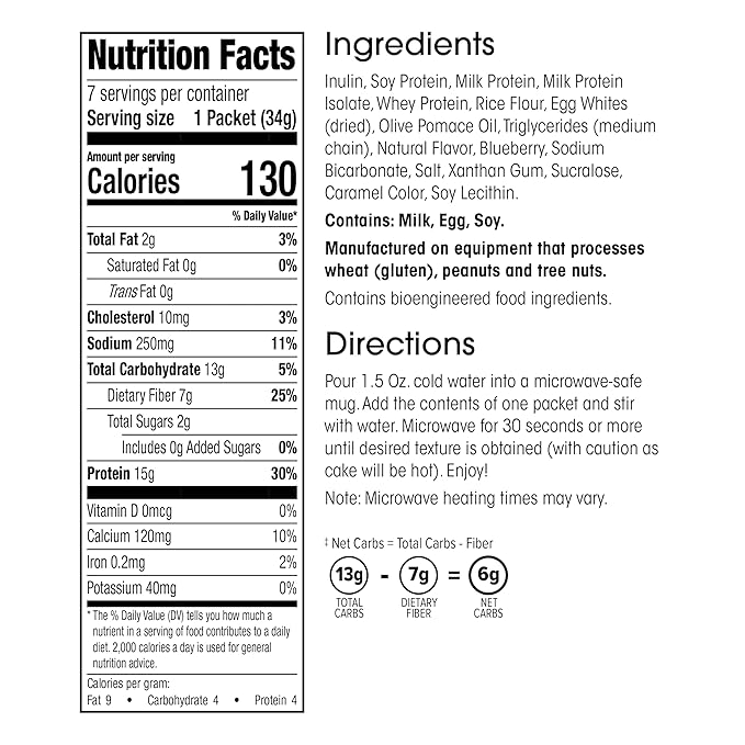 - Packed With Protein: Who says someone can't have their cake and eat it too? Our blueberry mug cake is packed with 15g protein - A protein dessert option, to help increase fullness for longer.
