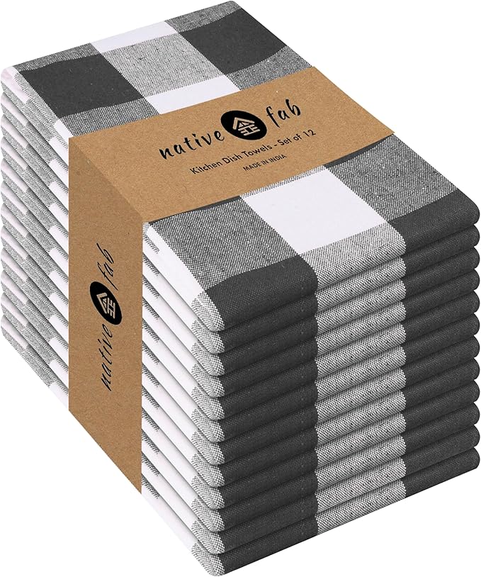 Native Fab 12-Pack Kitchen Towel with Hanging Loop 16x26 inches, Cotton Buffalo Check Kitchen Towels for Cleaning Drying, Washcloths Soft & Absorbent Cloth Rags, Bar Towel, Dish Cloth, Grey