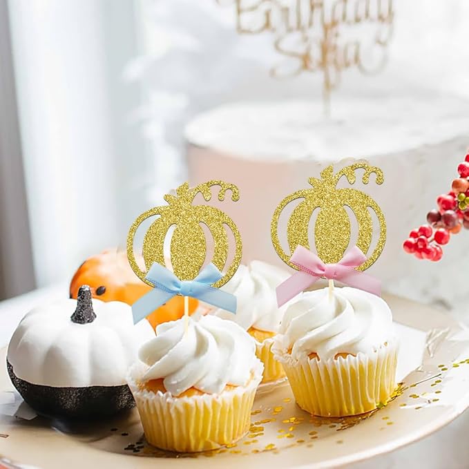 24pcs Pumpkin Gender Reveal Cupcake Toppers - Baby Shower Girl or Boy Party Decorations Supplies, Pumpkin Food Pick (Blue and Pink Bow)