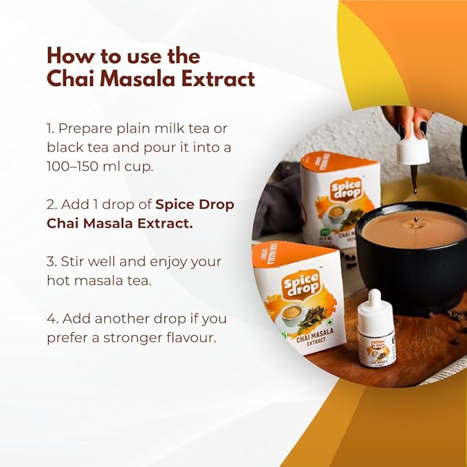 - ☺ SQUEEZE, DROP, STIR: Easy to use, with consistent taste. Can be used at the end of brewing or directly into the cup. Prepare Masala Chai in a breeze with just a drop in a cup of plain tea. No cooking required, add straight to tea. No trouble brewing spices. Can also be used in black tea, coffee, latte, and desserts (for the more experimental).