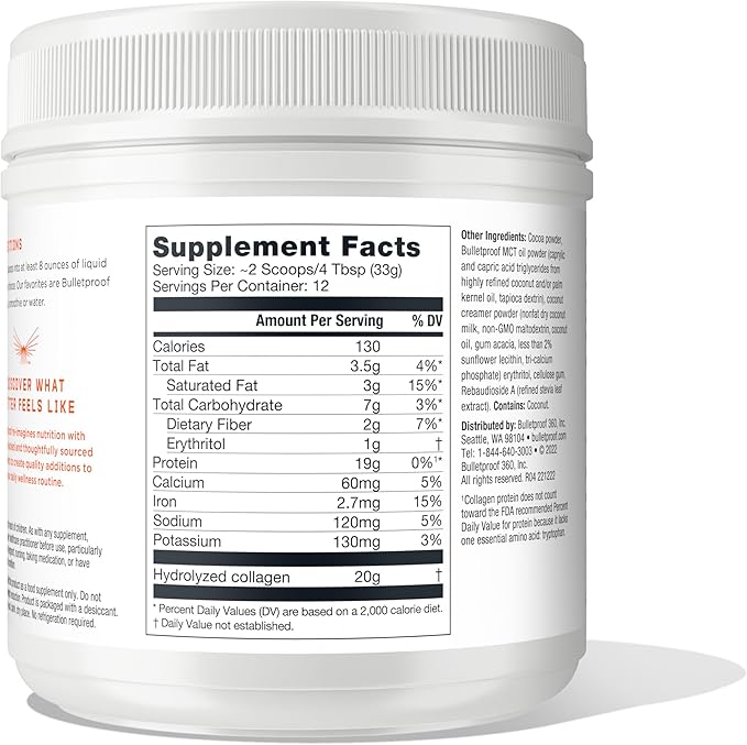 - Contains one 14.3-ounce jar Bulletproof Chocolate Collagen Peptides with MCT Oil