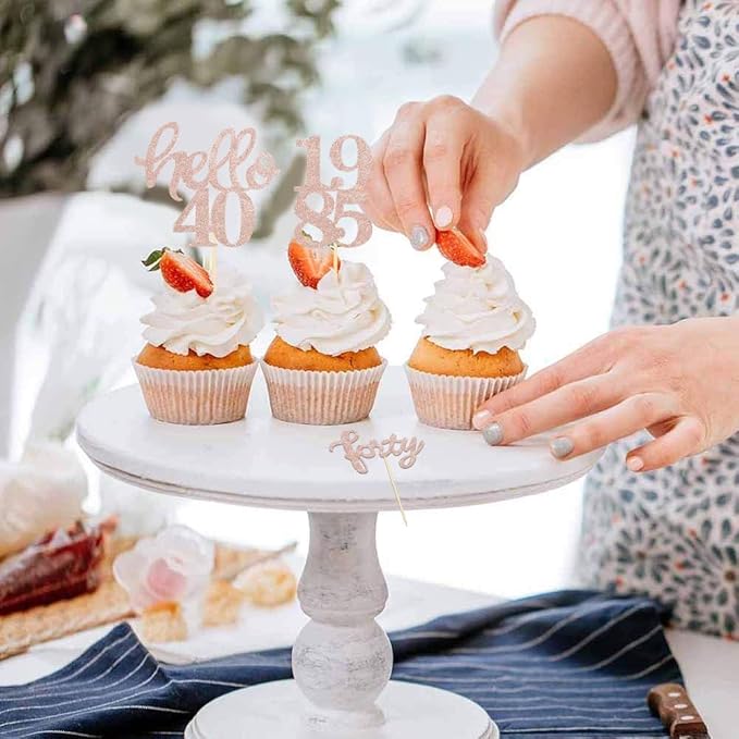 - Package Includes: 8 Pieces “1985” Number Glitter Cupcake Toppers, Size : 1.4 inch*2 inch; 8 Pieces “Forty”Glitter Cupcake Toppers, Size : 2.6 inch*1.6 inch; 8 Pieces “hello 40”Glitter Cupcake Toppers, Size : 2.6 inch*2.2 inch
