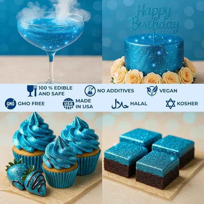 - 𝗙𝗢𝗢𝗗 𝗚𝗥𝗔𝗗𝗘𝗗, 𝗩𝗘𝗚𝗔𝗡 𝗙𝗥𝗜𝗘𝗡𝗗𝗟𝗬 & 𝗠𝗔𝗗𝗘 𝗜𝗡 𝗧𝗛𝗘 𝗨𝗦𝗔 Crafted with 100% safe food grade ingredients our glitter is tasteless, vegan, gluten and dairy free, halal and is made locally in the US. Our edible blue glitter is safe for kids and everyone it also works great as cake drip, cake decor for blue cake decorations for professional results without affecting its taste