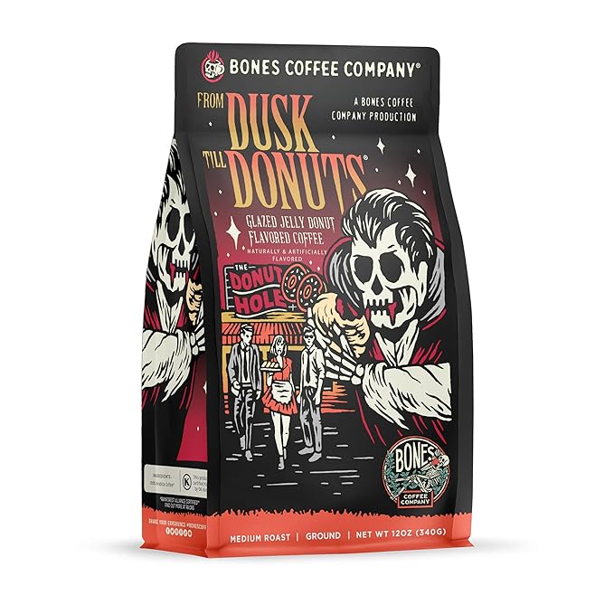 Bones Coffee Company From Dusk Till Donuts Jelly Donuts Flavored Coffee, Medium Roast Low Acid Arabica Beans Compatible with Auto drip and French Press Coffee Maker, 12 Oz Ground