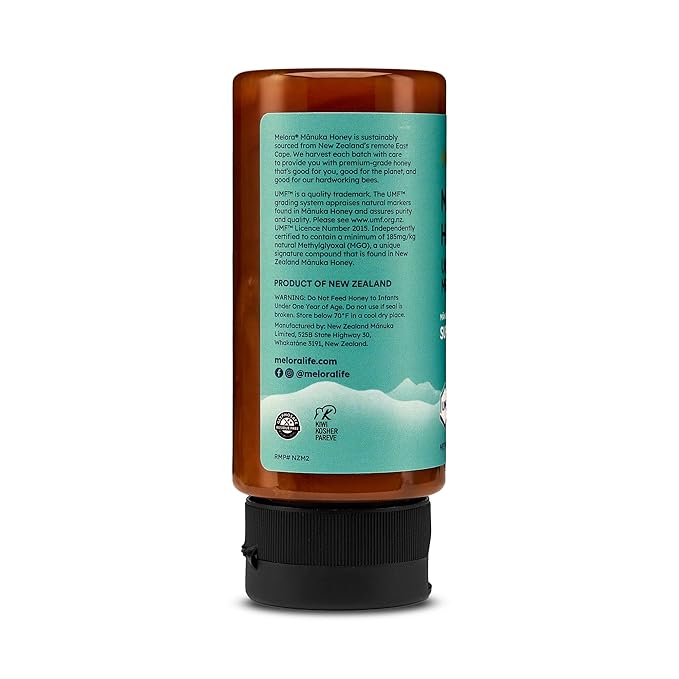 Melora Manuka Honey New Zealand Raw Honey | Pure, Unfiltered, Unpasteurized Honey | Organic Squeeze Bottle | UMF 8+ | MGO 185+ | 12 oz