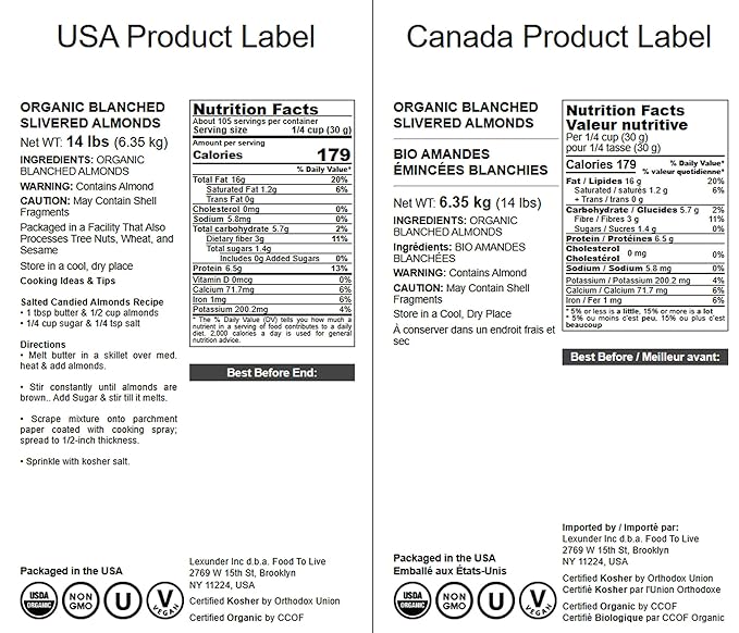 Food to Live Organic Blanched Slivered Almonds, 14 Pounds - Non-GMO, Raw, Unpasteurized, Unsalted, Vegan, Keto, Paleo, Kosher, Bulk, Protein, Dietary Fiber, For Cooking, Baking, Salads and Cereals