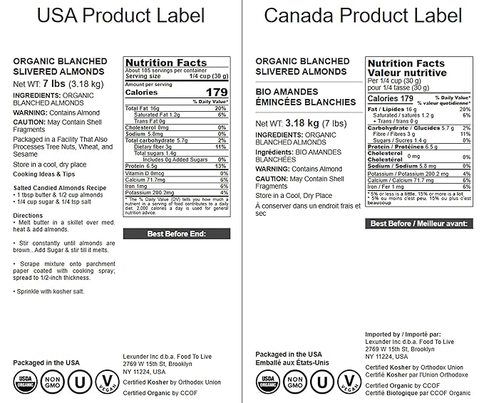 Food to Live Organic Blanched Slivered Almonds, 7 Pounds - Non-GMO, Raw, Unpasteurized, Unsalted, Vegan, Keto, Paleo, Kosher, Bulk, High in Protein, Dietary Fiber. For Cooking, Baking, Salads Cereals