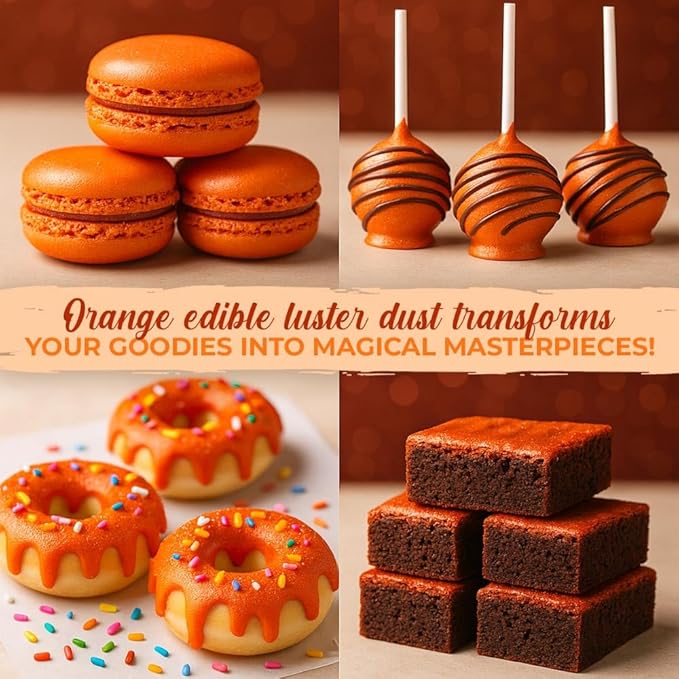 - ๐๐ข๐ข๐ ๐๐ฅ๐๐๐๐, ๐ฉ๐๐๐๐ก ๐๐ฅ๐๐๐ก๐๐๐ฌ & ๐ ๐๐๐ ๐๐ก ๐ง๐๐ ๐จ๐ฆ๐ Crafted with 100% safe food grade ingorangeients our luster dust is tasteless, vegan, gluten and dairy free, halal and is made in locally in the US. Our edible orange dust is safe for kids and everyone it also works great as cake drip, cake decor for orange cake decorations for professional results without affecting its taste