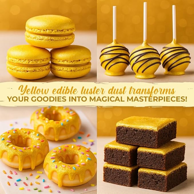 - ✨ 𝗟𝗨𝗦𝗧𝗘𝗥 𝗗𝗨𝗦𝗧 - This glamorous luster dust edible cake decorations and cupcake decorations can also be used as yellow food coloring or yellow edible paint for cakes to add colors and vibrance to your desserts