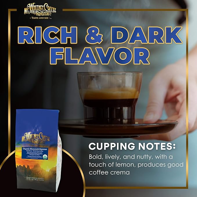 - RICH AND DARK FLAVOR - Organic Mammoth Espresso coffee produces good coffee crema. Bold, lively, and nutty, with a touch of lemon. Just the right blend when you’re looking for a rich and dark flavor of coffee.