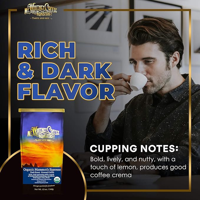 - RICH AND DARK FLAVOR - Organic Mammoth Espresso coffee produces good coffee crema. Bold, lively, and nutty, with a touch of lemon. Just the right blend when you’re looking for a rich and dark flavor of coffee.