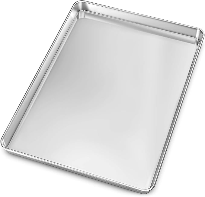 - DURABLE: Our stainless steel cookie sheet has superior mirror finish to reduce the risk of food sticking. Smooth roll edges make it comfortable to hold and transfer, rust free and durable for a long service time