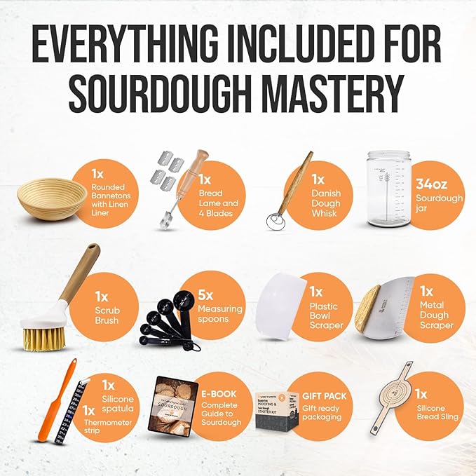 - ALL YOU NEED IN ONE HANDY KIT - Embrace the joy of sourdough bread making with our complete sourdough kit. Includes Glass Sourdough Starter Jar, 9" Round Proofing Basket, Bread Sling, Spatula, Dough Whisk, Scrapers, Thermometer Band and Scrub Brush