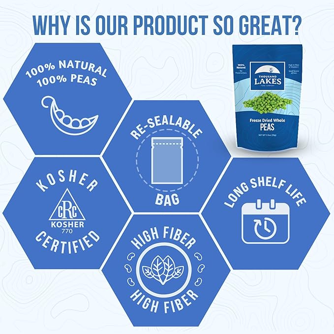 - Get more veggies! Our freeze-dried whole peas are a great, healthy, crunchy snack right out of the bag. They’re also quick to cook and perfect to have on hand to use in soups, stews, stir fry, pasta dishes, salad toppings, and more.