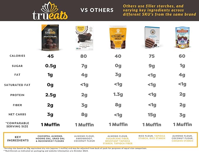 - PROTEIN & FIBER RICH: TruEats Dutch Chocolate Muffin & Cake Mix is crafted from carefully selected ingredients that are rich in both protein and fiber to provide great-tasting, sustained energy that satisfies your chocolate craving.