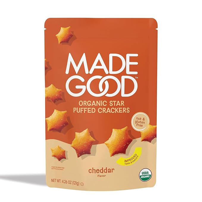 MadeGood Cheddar Star Puffed Crackers, 4.26oz Pouch, Organic Snacks