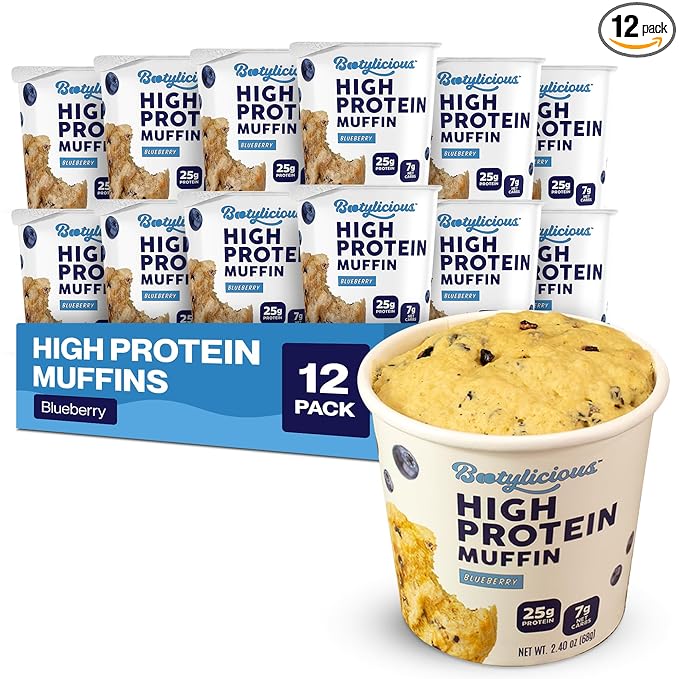 Bootylicious | High-Protein Muffin | 25g Protein, 7g Net Carbs, 2.32-2.75oz Cup, 12-Pack (Blueberry)