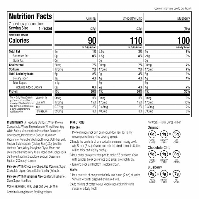 - Delicious Pancake & Waffle Mix: Not only is our protein & waffle mix a tasty treat for the taste buds but also a smart choice for those seeking a protein boost in their daily routine at only 90-110 calories & 2.5g or less of fat per serving.