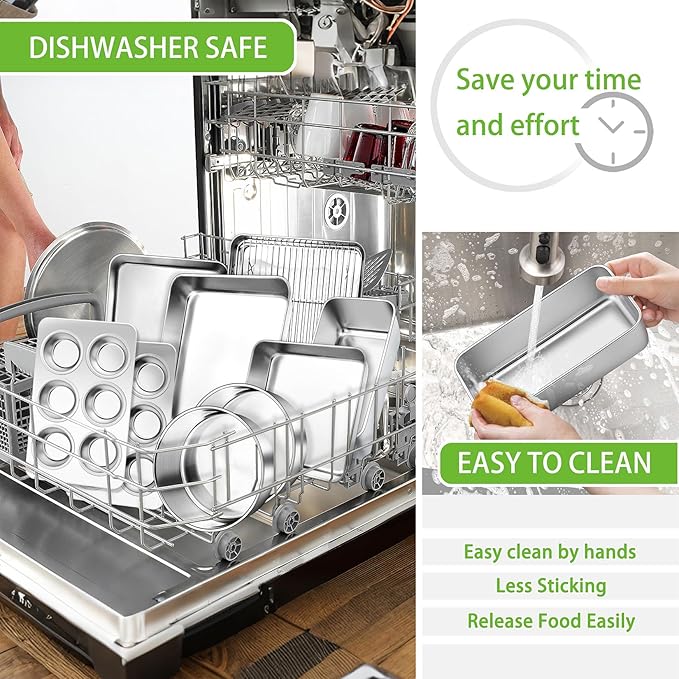 - 【HEALTHY BAKEWARE SET】Our baking pans and rack are made from pure stainless steel and lid is made from food-graded plastic, Will not release harmful materials into your food, Without any coatings peeling off, More unbreakable than the glass made, Heavy-duty construction ensure long-lasting lifetime and to be economical