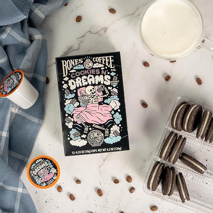 Bones Coffee Company Cookies 'N Dreams, Cookie and Cream Flavored Coffee Pods, Low Acid Medium Roast Single-Serve Bones Cups, Compatible with K-Cups Brewers Coffee Maker, 12 Count