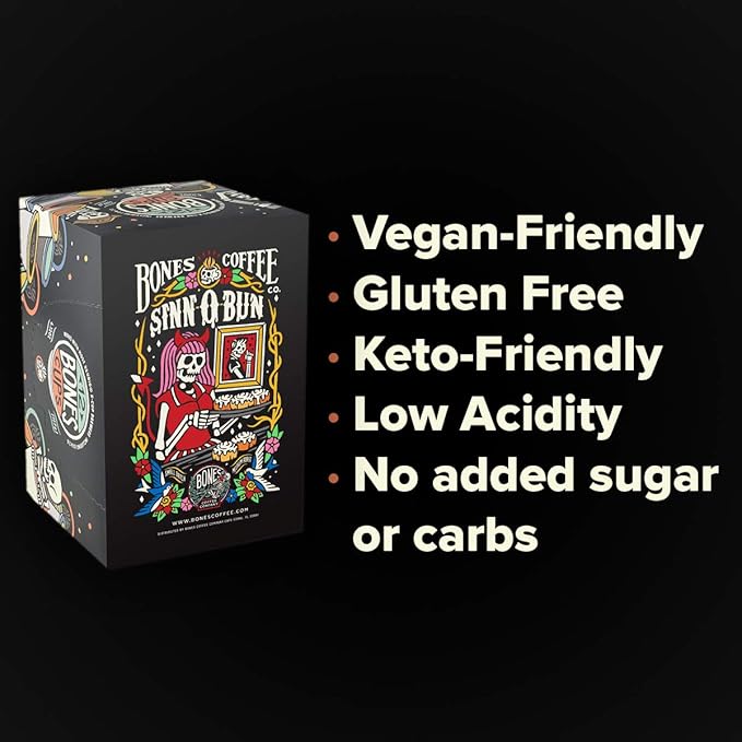 Bones Coffee Company Cinnamon Roll Flavored Coffee Pods, Low Acid Medium Roast Single-Serve Bones Cups, Compatible with 1.0 & 2.0 K-Cups Brewers Coffee Maker, 12 Count