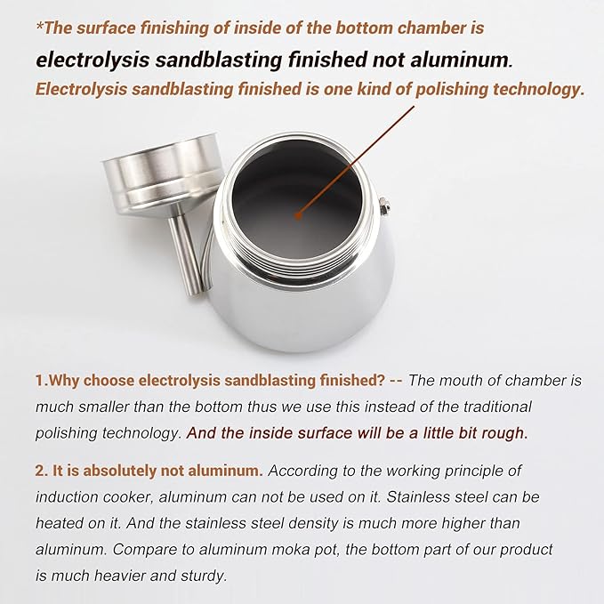 - 3 ⭐ELEGANT DESIGN & STRUCTURE DETAILS -- With sleek and beautiful appearance, the espresso pot must be a modern and elegant addition to kitchen. Mirror polished. U style spout easy pour. Heat resistant handle. The lid on the top can be left open.