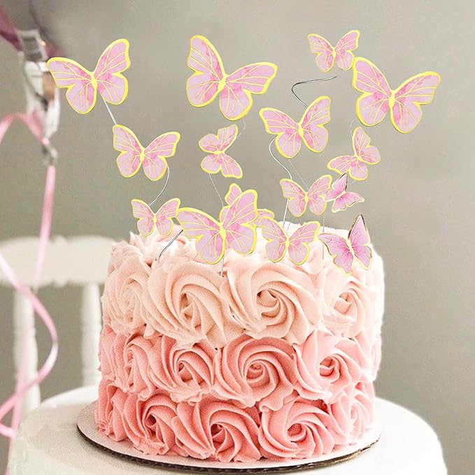 - (NOT EDIBLE)BUTTERFLY CAKE DECORATIONS PACKAGE INCLUDED - Cake decorations total 66pcs pink assembled gold color butterfly cupcake topper, includes dot glue and support stick.with four size, 2.6x2inches, 2.2x1.6inches, 2x1.4inches,1.6x1.2inches.