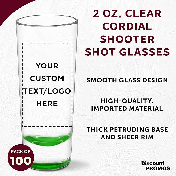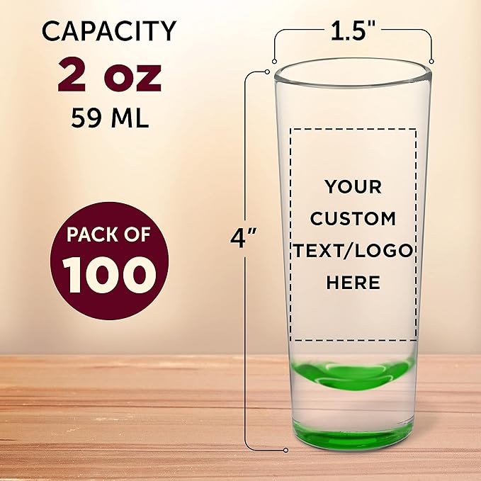 Custom Cordial Shooter Shot Glasses 2 oz. Set of 100, Personalized Bulk Pack - Great for Birthdays, Parties, Indoor & Outdoor Events - Green