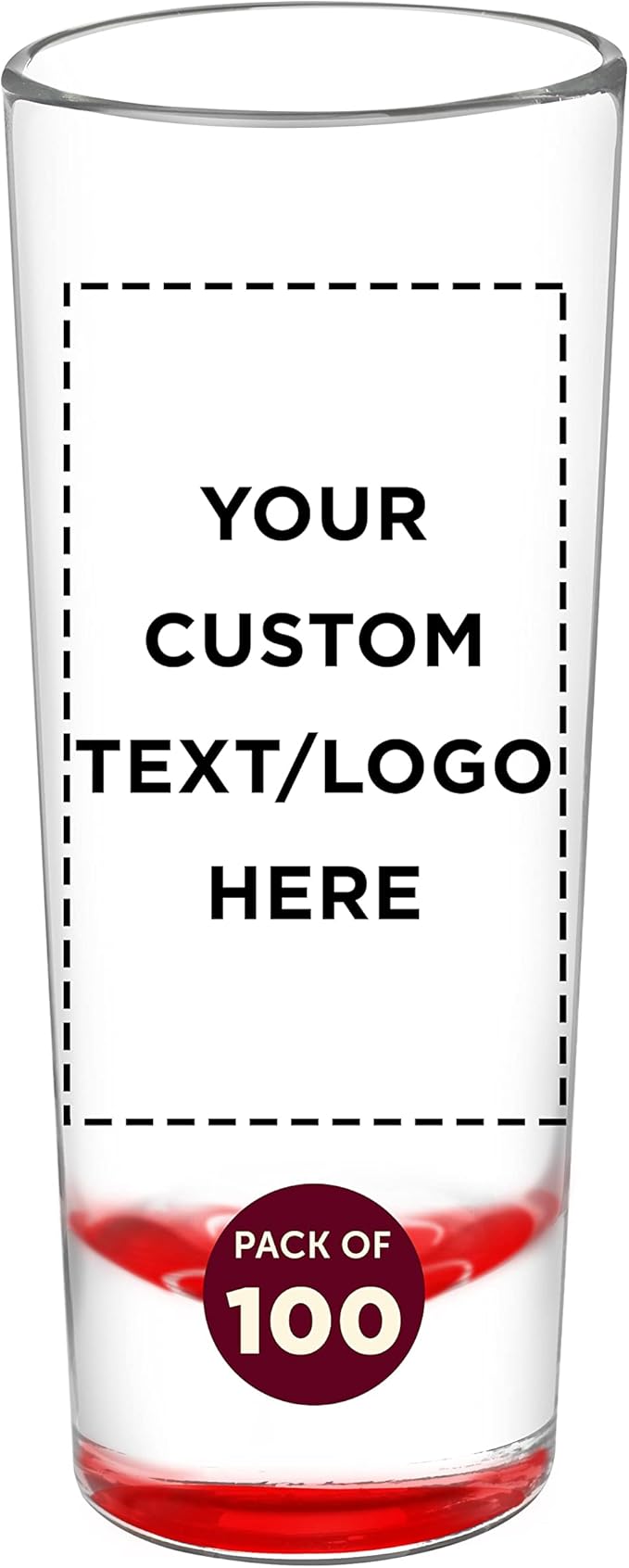 Custom Cordial Shooter Shot Glasses 2 oz. Set of 100, Personalized Bulk Pack - Great for Birthdays, Parties, Indoor & Outdoor Events - Red