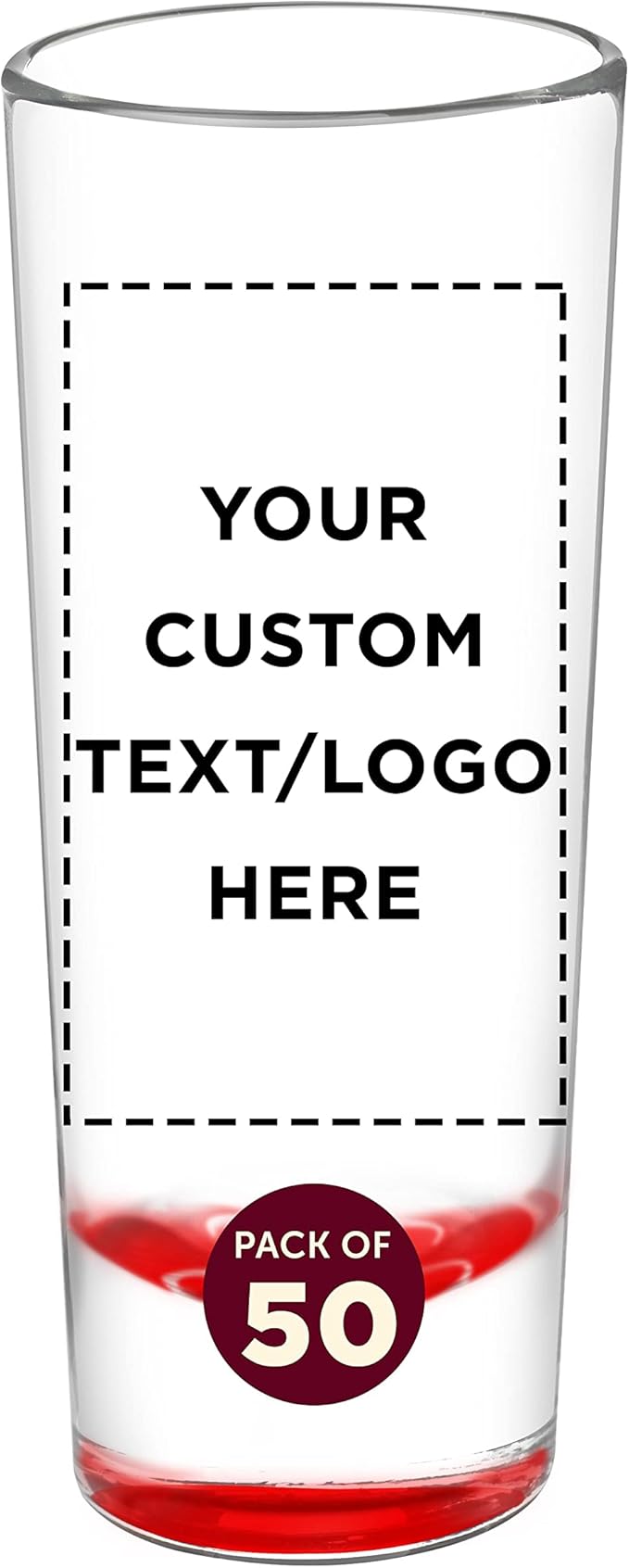 Custom Cordial Shooter Shot Glasses 2 oz. Set of 50, Personalized Bulk Pack - Great for Birthdays, Parties, Indoor & Outdoor Events - Red
