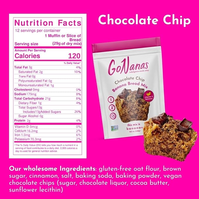 GoNanas Chocolate Chip Oat Flour Banana Bread Mix, Suitable for Plant Based Vegan Diets, Gluten Free Dairy Free Snacks, Healthy Snacks For Adults, Muffin Mix, Nut Free, Cupcakes Dessert, NON-GMO, 1pk