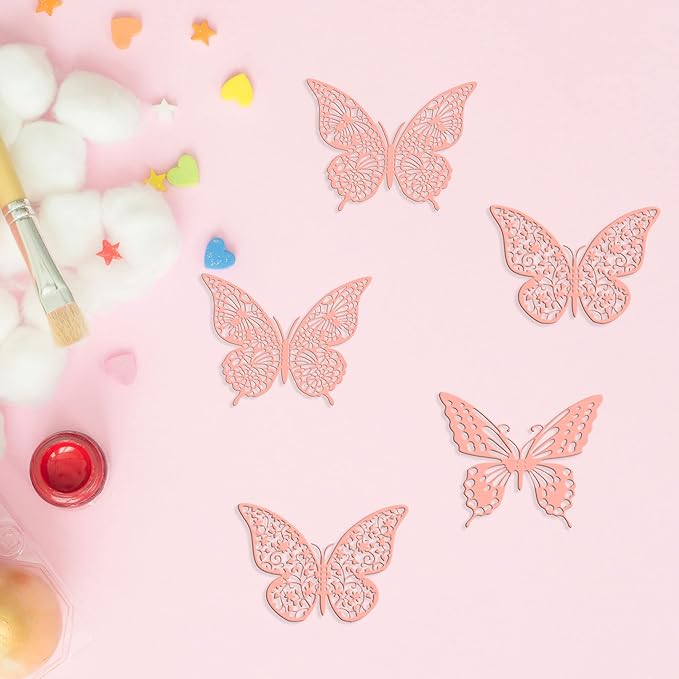 Gyufise 36 Pack Pink Glitter 3D Cupcake Toppers - Hollow Butterfly Cake Decorations for Birthday Wedding Fairy Party - Wall Sticker Decal for Background Wall Decoration