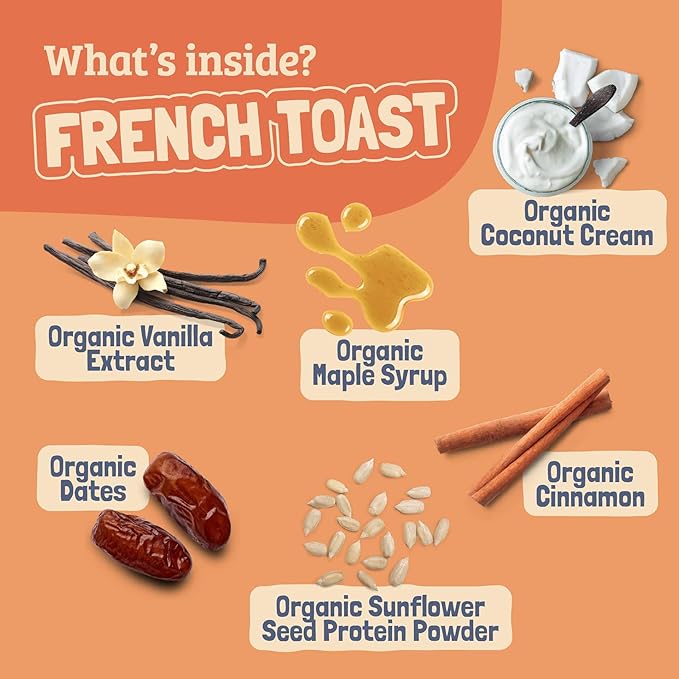 - ORGANIC KIDS SNACK BARS: Breakfast in bar form! Cinnamon, maple syrup, and a hint of vanilla blended with dates make French Toast one of our yummiest bars yet. This vegan French Toast bar is free from gluten, dairy, and eggs — a conveniently delicious way to start your morning!