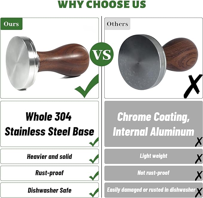 - ANTI-CORROSION: The thread of the interface between the wooden handle and the bottom is made of stainless steel, which will not rust and corrode when exposed to water, and is easy to clean. The bottom of the stainless steel compared to other products will not corrode and will not rust. The tamper base is dishwasher safe, but the handle is not.