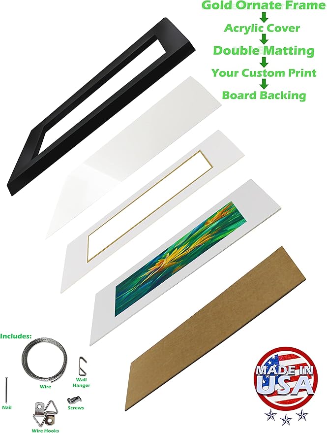 - Custom Gold Ornate Wood Frame / Fits 15x32 Image Size with Double Matting / Fits 19x36 Image Size without Matting / 23x40 Overall Inches After Framing