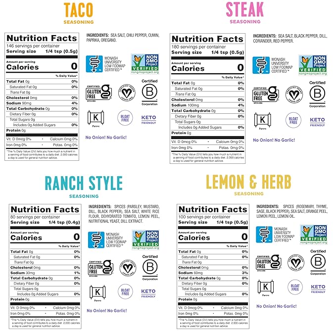 - Flavor Without Discomfort: Variety is the spice of life. Our Low FODMAP Seasonings are specifically designed for people living with IBS - made without onion or garlic and packed with all-natural herbs and spices