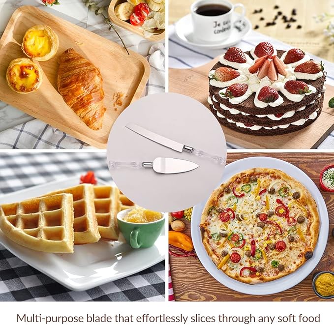 - 🍰Premium Material- Imitated crystal handles with stainless steel blades, mirror polished, rust-proof, high-temperature and corrosion-resistant. Cake server is 10.8 inch/27.5cm long, cake knife is 13.2 inch/33.5cm long, the perfect size for cake cutting and serving.